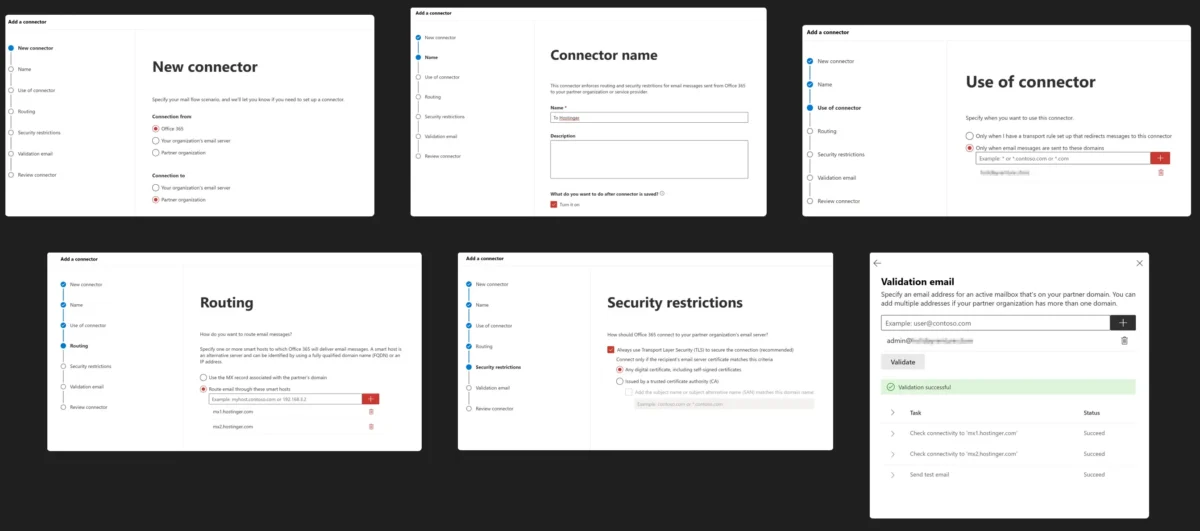 This is called an internal relay domain in Exchange Online. You also create a connector from Microsoft 365 to Hostinger. The connector is just a safe route that says, “for unknown users on this domain, relay mail to mx1.hostinger.com and mx2.hostinger.com”.